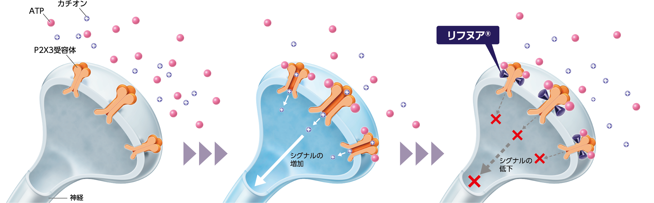 - せきは、気道内のATP*2という物質がP2X3受容体に結合することで、受容体が開いて陽イオン(カチオン)が通過し、その刺激が神経を伝わって起きることがあります。